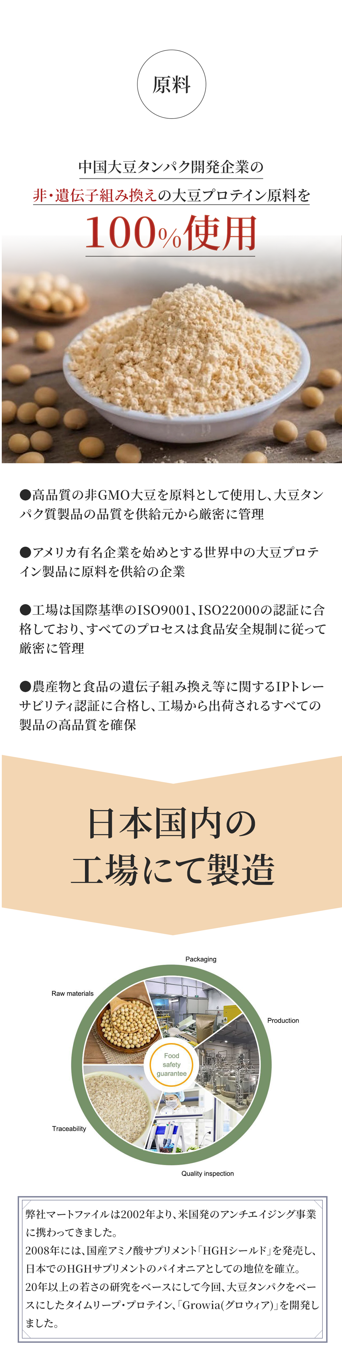 Growia(グロウィア)には、大豆由来の植物プロテインを、1回分に「21g」を配合。
